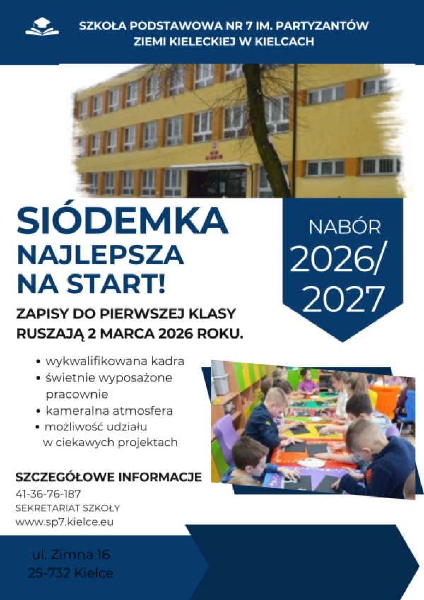 DYREKTOR SZKOŁY PODSTAWOWEJ NR 7 IM. PARTYZANTÓW ZIEMI KIELECKIEJ W KIELCACH OGŁASZA ZAPISY DO KLASY I NA ROK SZKOLNY 2026/2027
