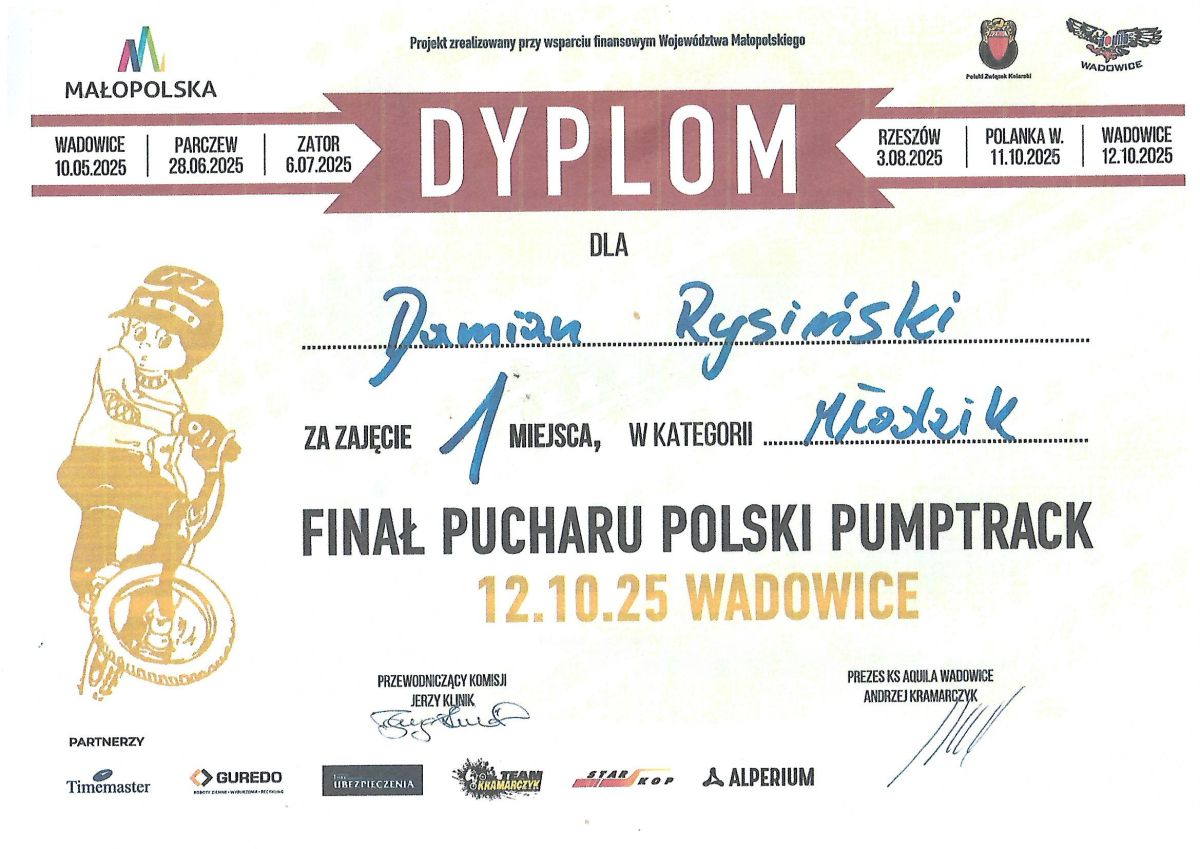 Uczeń naszej szkoły Damian Rysiński zajął I miejsce w PUCHARZE POLSKI PUMPTRACK 2025, który odbył się 12 października w Wadowicach. Gratulujemy Damianowi sukcesu i życzymy dalszych osiągnięć !!!