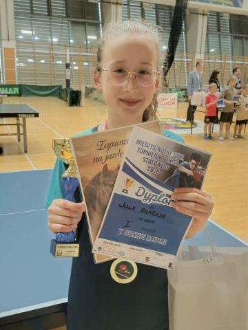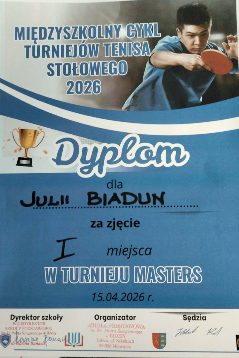 Julia nie zwalnia tempa, a z każdym startem osiąga coraz lepsze wyniki, dostarczając  nam wiele powodów do dumy!  Tym razem uczennica klasy 4a zwyciężyła w Międzyszkolnym Cyklu Turniejów Tenisa Stołowego, który odbył się 15.04.2026r. w Szkole Podstawowej im.Ks.P. Ściegiennego w Bilczy. Nagrodą i dużym wyróżnieniem, za tak udane występy naszej uczennicy, jest awans do zawodów wyższego szczebla oraz zaproszenie do kadry województwa młodziczek w tenisie stołowym. W najbliższym czasie Julia wystartuje w Mistrzostwach Polski oraz Grand Prix Polski Masters. Gratulujemy Julii, trzymamy kciuki i życzmy dalszych sukcesów sportowych!!!