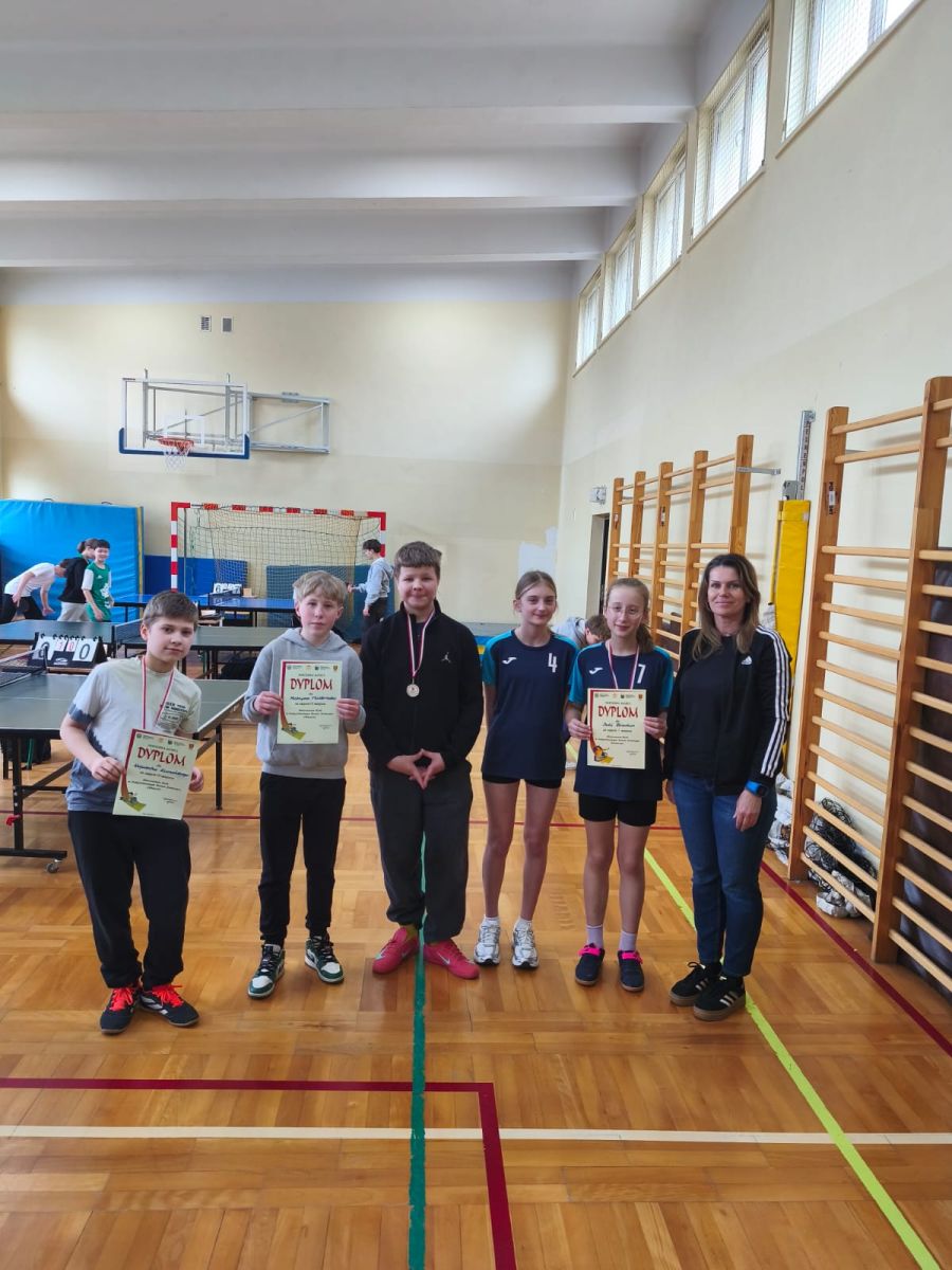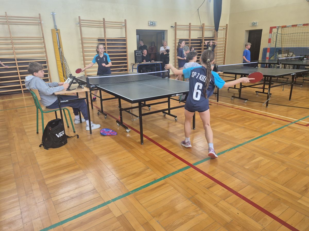 30.03.2026r. w SP nr 15 odbyły się Indywidualne Mistrzostwa Kielc w Tenisie Stołowym Dziewcząt i Chłopców – rocznik 2013 i mł. Wśród bardzo licznie zgromadzonych uczestników tegorocznych mistrzostw, reprezentacja naszej szkoły okazała się bezkonkurencyjna i wywalczyła aż cztery medale. W kategorii dziewcząt Mistrzynią Kielc została Julia Biadun z klasy 4a, pokonując w finale znacznie starszą od siebie zawodniczkę gospodarzy wynikiem 2:0. Emocjonujący, stojący na bardzo wysokim poziomie mecz o złoty medal, rozegrał uczeń klasy 6a Nikodem Kokocki z zawodnikiem SP1, pokonując go 2:1. Brązowe medale przypadły Alicji Janiszewskiej z klasy 5a i Wojciechowi Kumańskiemu z klasy 6a, a Maksym Masternak również z 6a wywalczył czwarte miejsce.