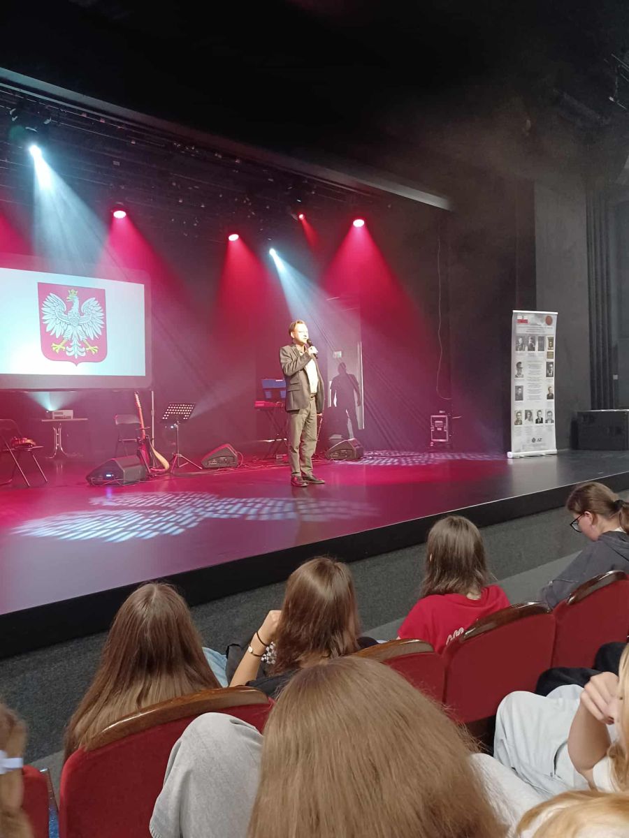 Dnia 12 września br. uczniowie klas 7-8 wzięli udział w Śpiewającej Lekcji Historii, zorganizowanej przez Wojewódzki Dom Kultury w Kielcach. Gościem specjalnym był Zespół Galasy, znany z niezwykle poruszających prezentacji pieśni patriotycznych połączonych z narracją historyczną Zajęcia miały na celu przybliżenie uczniom ważnych wydarzeń z historii Polski poprzez muzykę – pieśni patriotyczne, wojskowe oraz piosenki opisujące kluczowe momenty dziejowe, takie jak powstanie Legionów Polskich, czy działalność Armii Krajowej. Uczniowie nie tylko słuchali, ale również wspólnie śpiewali wybrane utwory. Wśród prezentowanych pieśni znalazły się m.in.: Ja to mam szczęście, Szara piechota, Szumi bór, szumi las. Zajęcia cieszyły się dużym zainteresowaniem i zaangażowaniem młodzieży. Taka forma nauczania pozwoliła im lepiej zrozumieć emocje towarzyszące wydarzeniom historycznym oraz utrwalić wiedzę w atrakcyjny sposób. Śpiewana Lekcja Historii okazała się ciekawym i skutecznym sposobem popularyzacji wiedzy historycznej. Niezwykle cennym źródłem tejże wiedzy okazał się być p. Marek Zapała- historyk, autor licznych publikacji dotyczących II wojny światowej, prezes Niezależnego Światowego Związku Żołnierzy Armii Krajowej oraz członek Polskiego Towarzystwa Historycznego w Limanowej. To był bardzo dobrze wykorzystany czas- uczestnictwo w sztuce skłania do refleksji nad sobą, światem i wartościami.
