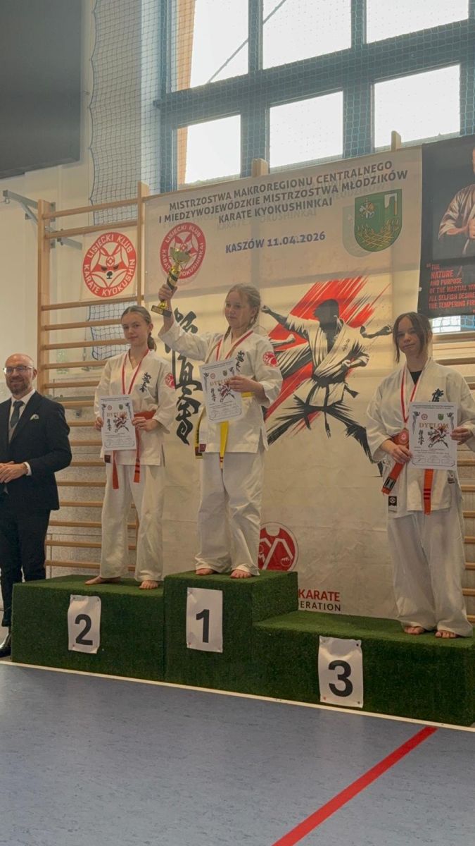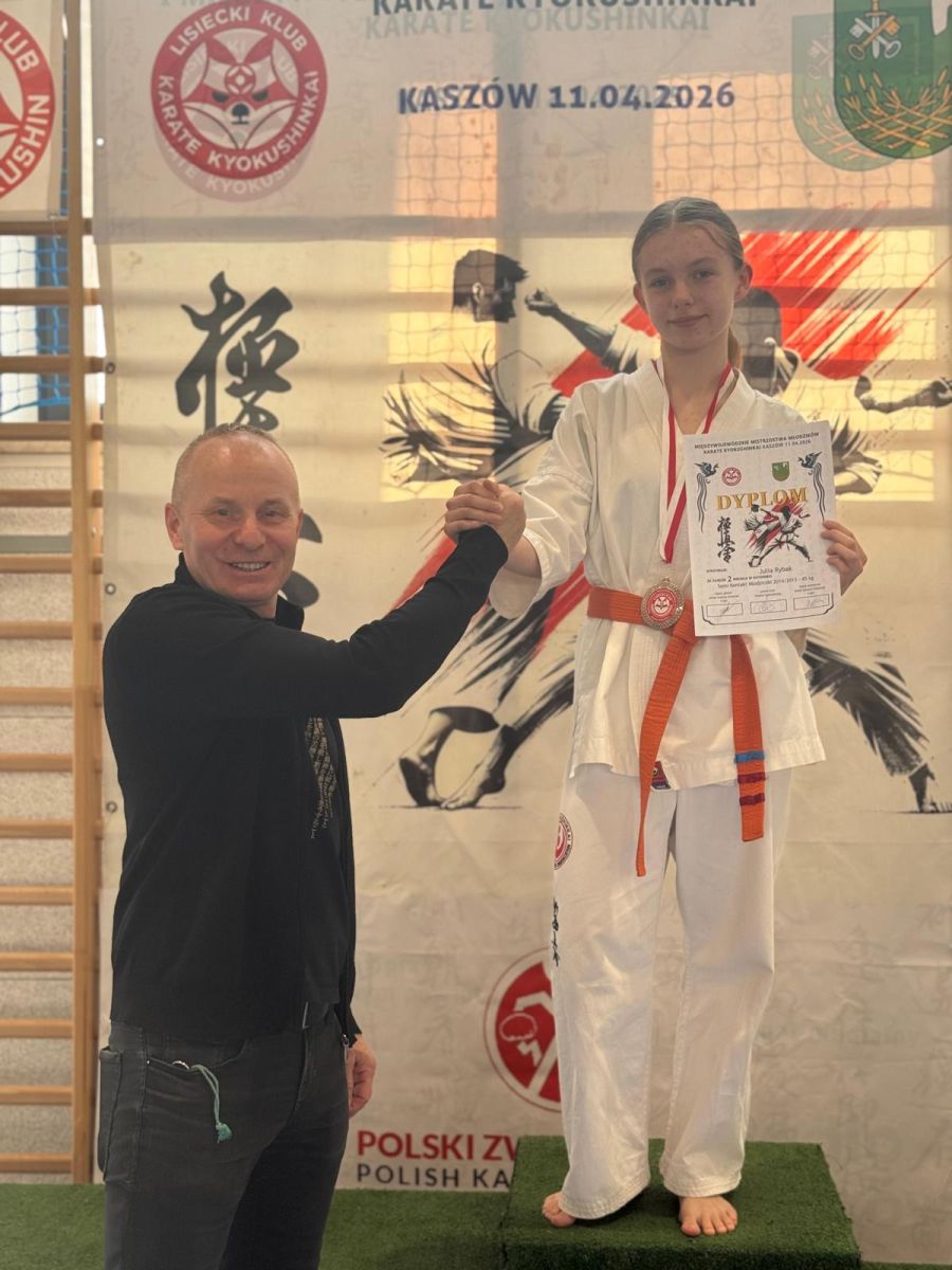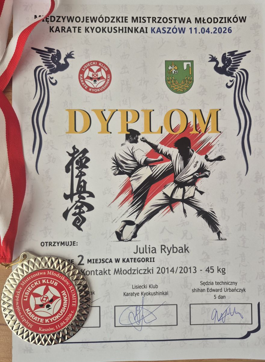 11 kwietnia 2026r. odbyły się w Kaszowie Międzywojewódzkie Mistrzostwa Młodzików Karate Kyokushinkai. Turniej składał się z kata, czyli sekwencji z góry ustalonych ruchów-bloków, kopnięć i uderzeń wykonywanych w określonej kolejności oraz walk. Nasza uczennica Julia Rybak z klasy VIa zajęła IV miejsce w kata i II w walkach w kategorii 12-13 lat -45 kg.