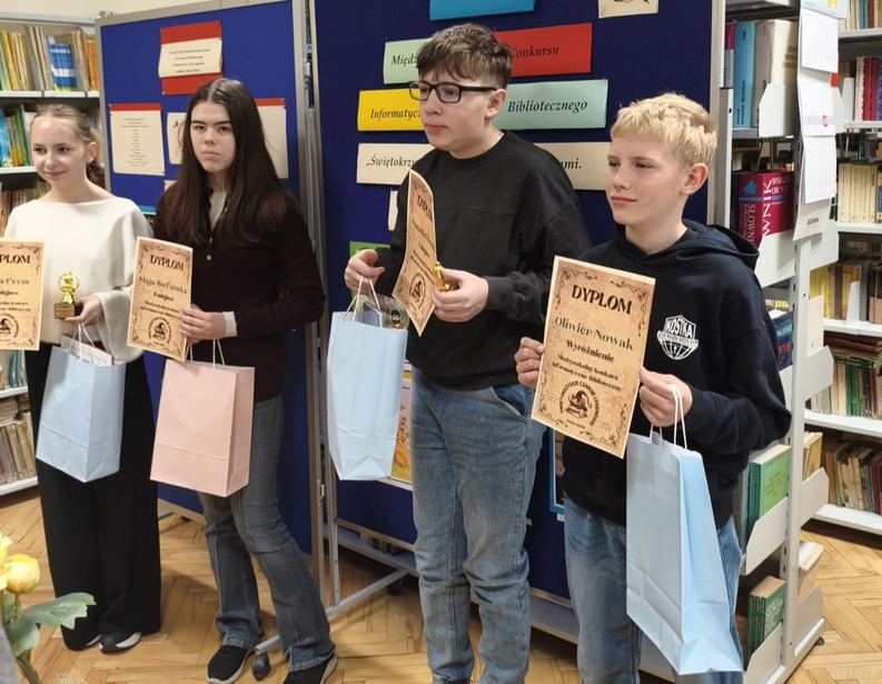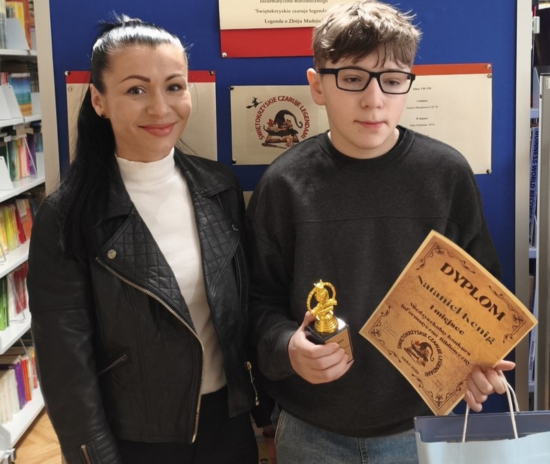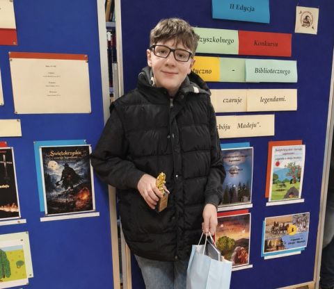 24 kwietnia 2026 r.  odbyło się podsumowanie Międzyszkolnego Konkursu Informatyczno-Bibliotecznego na okładkę do książki ,,Świętokrzyskie czaruje legendami. Legenda o zbóju Madeju”. Nataniel Kenig zdobył I miejsce w kategorii uczniów z klas 4-6. Serdecznie gratulujemy!