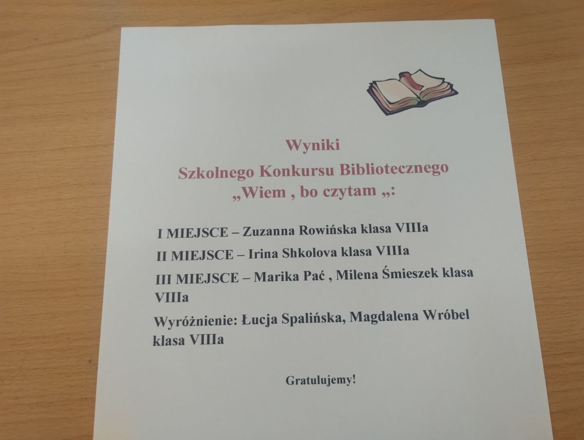 Wyniki Szkolnego Konkursu Bibliotecznego "Wiem, bo czytam".