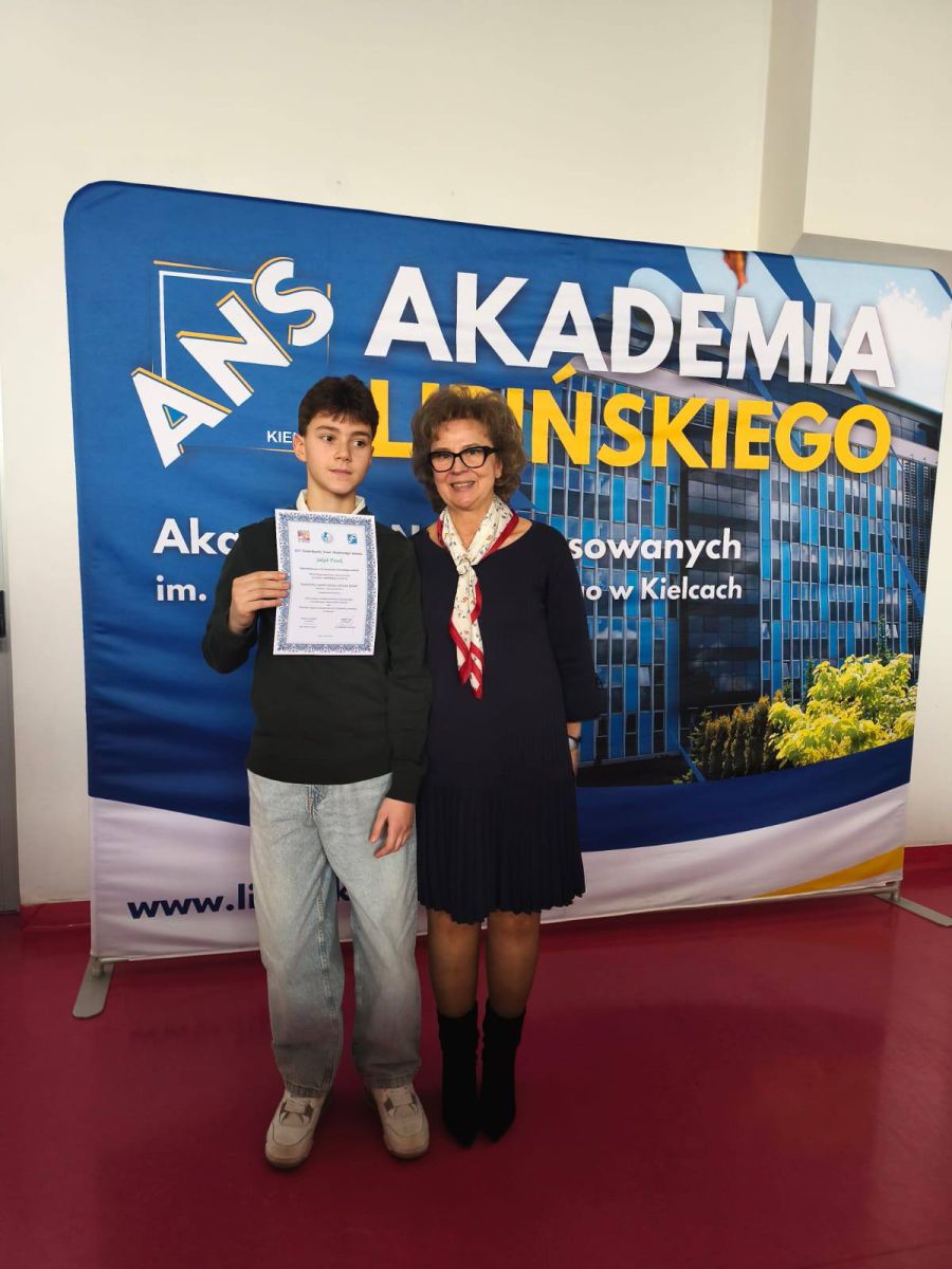 Miło nam poinformować, że uczeń klasy VI a - Jakub Fronk zdobył wyróżnienie w konkursie informatycznym "Stwórzymy razem lepszy cyfrowy świat"- kategoria szkoła podstawowa. Uroczyste wręczenie dyplomu i nagrody miało miejsce podczas XIV Świętokrzyskiego Dnia Bezpiecznego Internetu organizowanego przez Samorządowy Ośrodek Doradztwa Metodycznego i Doskonalenia Nauczycieli w Kielcach oraz Akademię Nauk Stosowanych w Kielcach. Wyróżnienie w konkursie jest efektem pracy, zaangażowania oraz rozwijania zainteresowań Jakuba. Serdeczne podziękowania kierujemy również do nauczycielki informatyki - Pani Moniki Zawadzkiej - Chłopek za zaangażowanie, wsparcie i inspirację, które zaowocowały sukcesem ucznia.