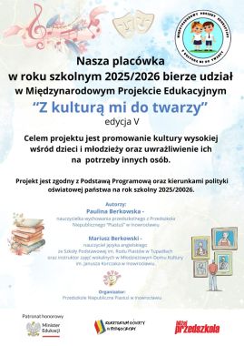 W roku szkolnym 2025/2026 świetlica szkolna, we współpracy z wychowawcami klas I–III, realizuje Międzynarodowy Projekt Edukacyjny „Z kulturą mi do twarzy”.